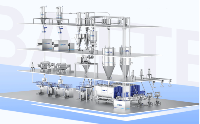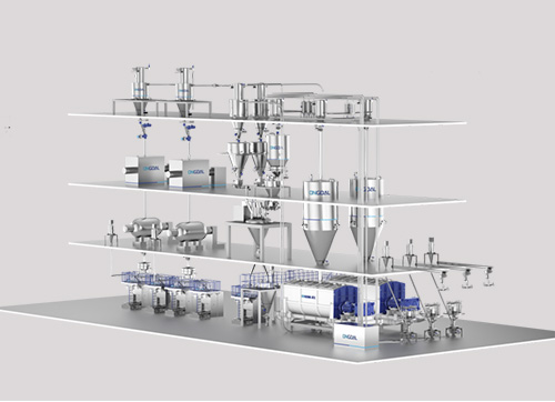 我們從解包投料、儲(chǔ)存破拱、氣力輸送、計(jì)量配料到混合攪拌的整個(gè)工藝流程,全方位多角度考慮生產(chǎn)的潔凈、便利與安全,為客戶提供一整套食品級原料處理一站式解決方案。